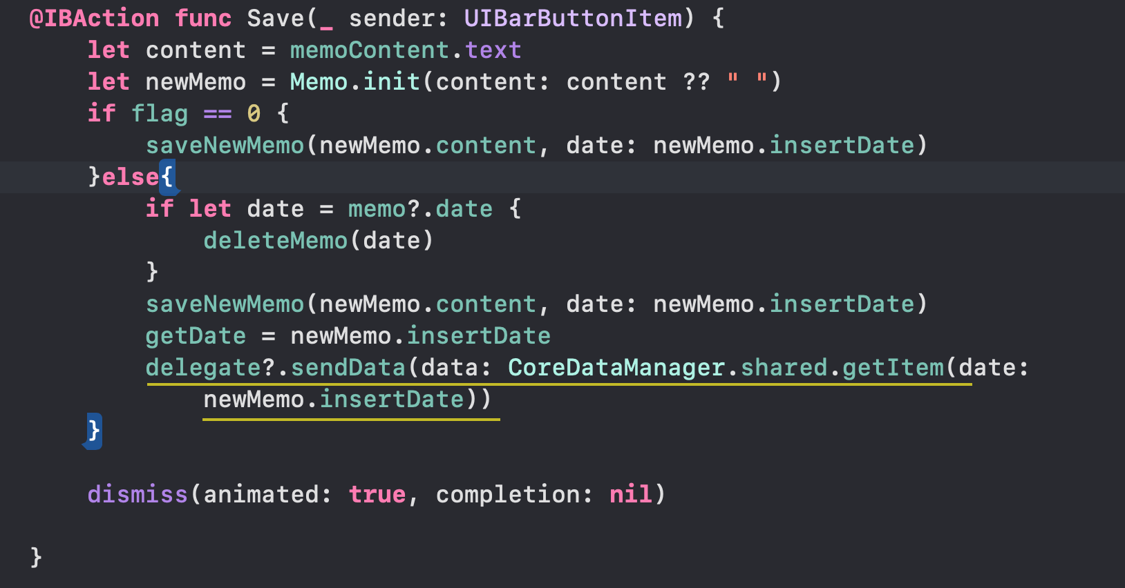 메모를 save 하고자 할 때, 전달하고자 하는 data를 delgate.sendDate의 인자로 넣어주고. dismiss 하는 모습.