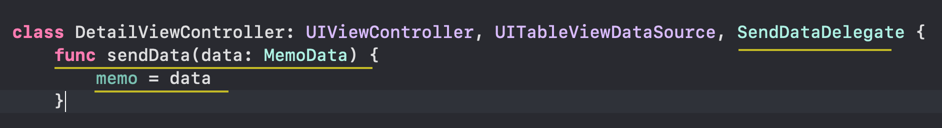 채택하고 채택한 프로토콜의 함수를 구현해주는 모습. ( memo 라는 변수에 전달되어온 data를 저장합니다 )
