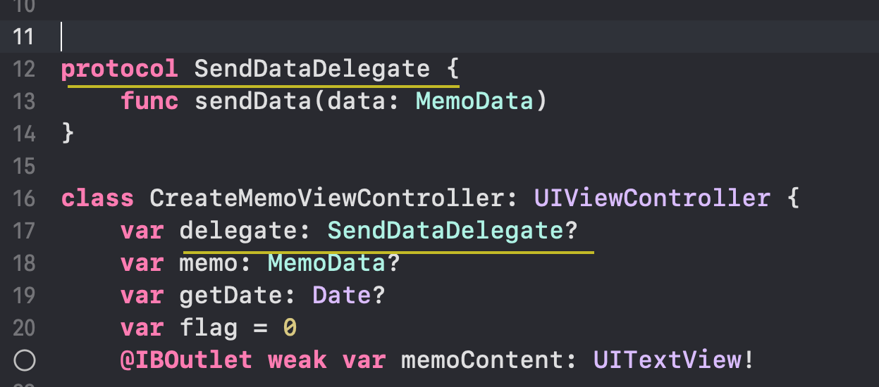 메모를 create하는 vc에서 (메모)데이터를 전달하는 함수를 포함하는 protocol을 생성해줍니다. ( SendDateDelegate )